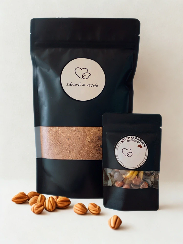 Složení: lískové ořechy, vegan hořká čokoláda, kakaové boby, sušený banán(100%)